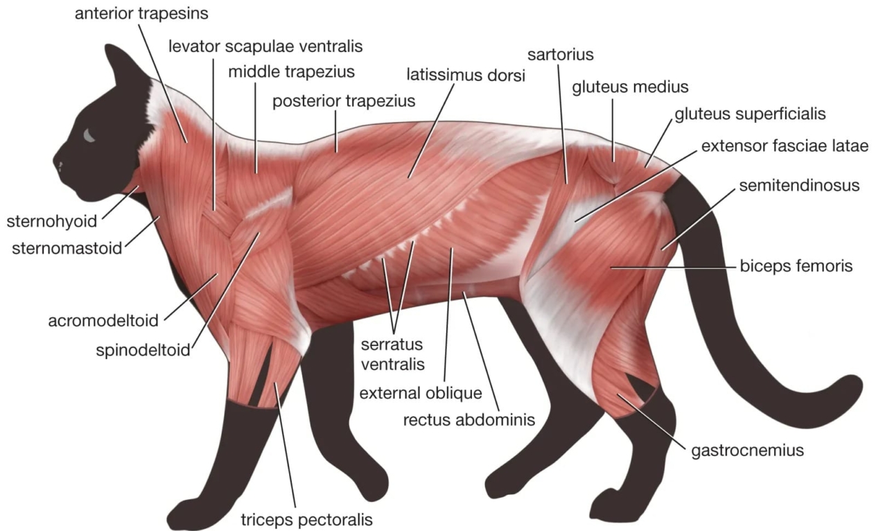 Тіло кота вкрите понад 500 м’язами, зокрема сильними задніми кінцівками, що відповідають за стрибки. Його м’язи працюють плавно й синхронно — тому кіт не просто ходить, а «тече». Унікальна структура м’язів також дозволяє коту обертати вуха, піднімати шерсть під час страху (ефект «роздутого» кота) та залишатися майже непомітним під час полювання.