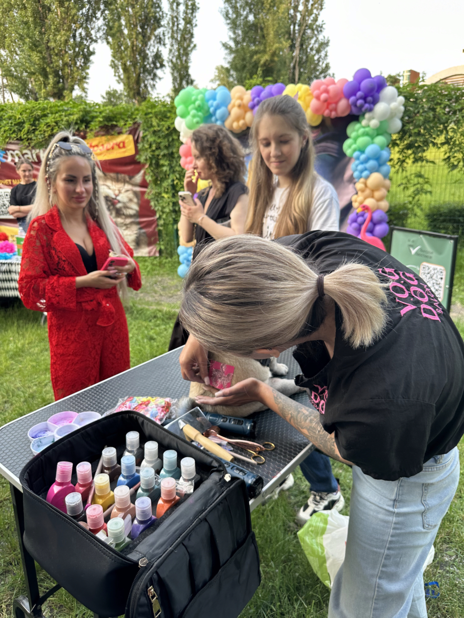 Zu unseren Kunden gehören Möpse, Yorkies, Huskies, Maltipoos, Bulldoggen und Chinese Cresteds. Einige von ihnen mussten einfach nur gekratzt werden, andere mussten gefärbt werden, und manchmal mussten sie einfach nur umarmt werden. Eine taube französische Bulldogge aus dem Tierheim bekam ein Glitzertattoo in Form des ukrainischen Wappens – dieser Moment wurde zum Symbol des ganzen Tages.