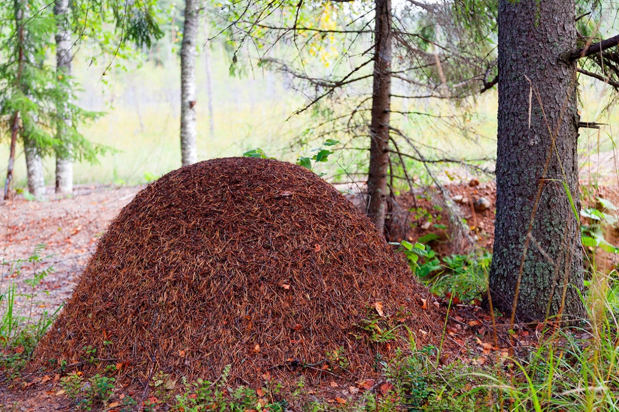 Jeder Ameisenhaufen hat eine Struktur, auch wenn die Größe des Ameisenhaufens oft je nach Ameisenart oder Anzahl der Familienmitglieder variiert. Er ist in zwei Teile unterteilt: den oberirdischen und den unterirdischen Teil. Der Ameisenhaufen kann als ein ganzes separates Reich bezeichnet werden, mit Zellen wie dem ‚Quartier der Königin‚, wo sie ihre Eier ablegt; der ‚Kinderstube‚, in der sich die Eier entwickeln und die Larven geboren werden; der‚ Brotkammer ‚, in der die Ameisen ihre ‚vegane‘ Nahrung lagern; der‚Fleischkammer‚, in der tote Insekten gelagert werden; dem‚Solarium‚. – eine Kammer unter dem obersten Teil des Ameisenhaufens, in der sich die Ameisen aufwärmen; die „Überwinterungskammer„, die sich im unterirdischen Teil des Ameisenhaufens befindet und in der die Ameisen überwintern; die„Scheune„, in der Blattläuse wachsen; der„Friedhof„. Interessanterweise wissen die Ameisen, dass tote Körper eine Brutstätte für Infektionen sein und Krankheiten verursachen können, weshalb sie ihre Überreste aus dem Ameisenhaufen an einen speziell dafür vorgesehenen Ort bringen.