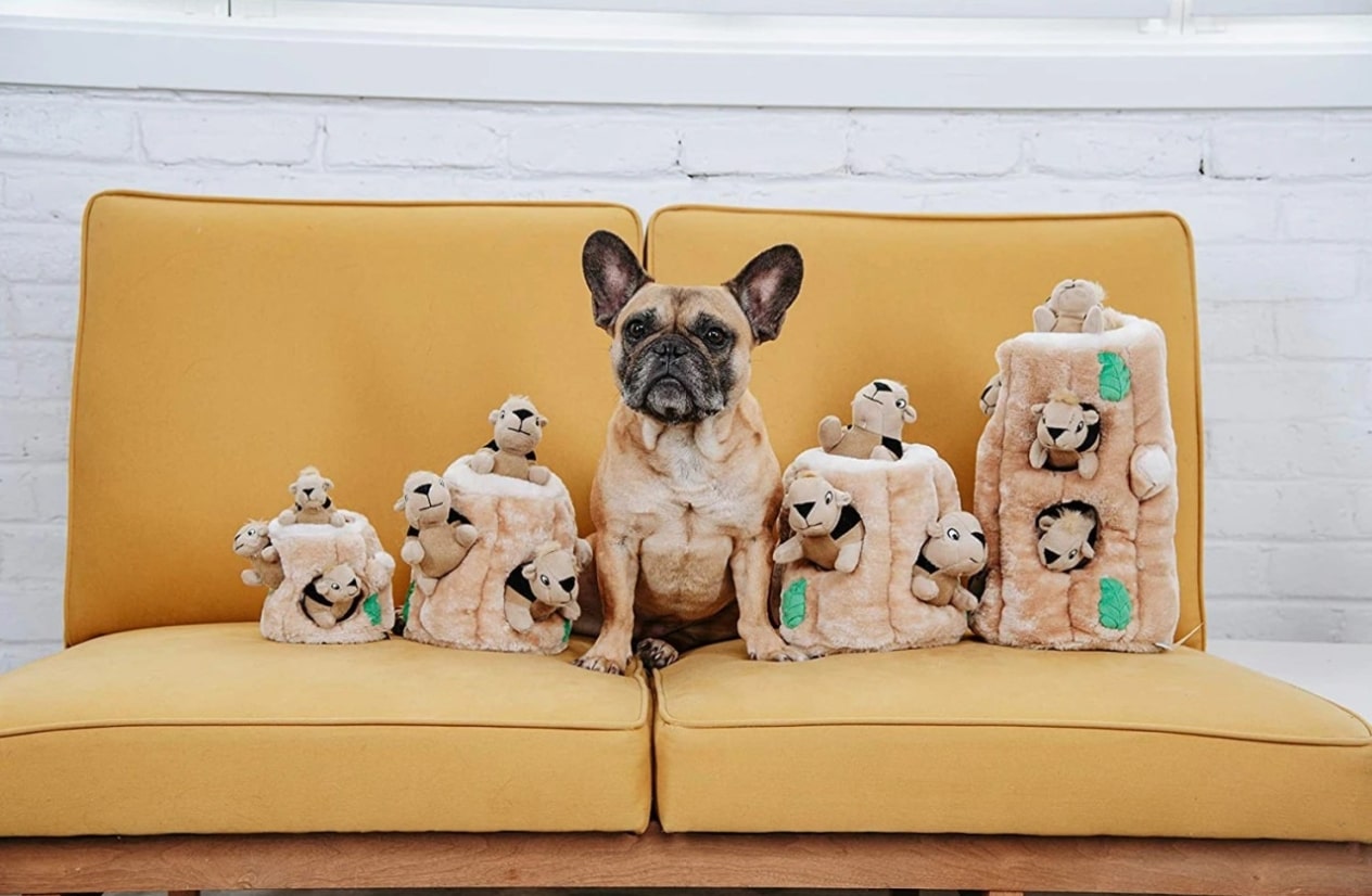 Das ist ein weiches interaktives Hundespielzeug in Form eines Baumes mit kleinen Plüsch-Eichhörnchen im Inneren. Der Hund muss sie mit Hilfe seines Geruchssinns, seiner Zähne und seiner Pfoten apportieren. Dieses Spiel weckt den Jagdinstinkt des Tieres und bereitet ihm echte Freude beim Apportieren.