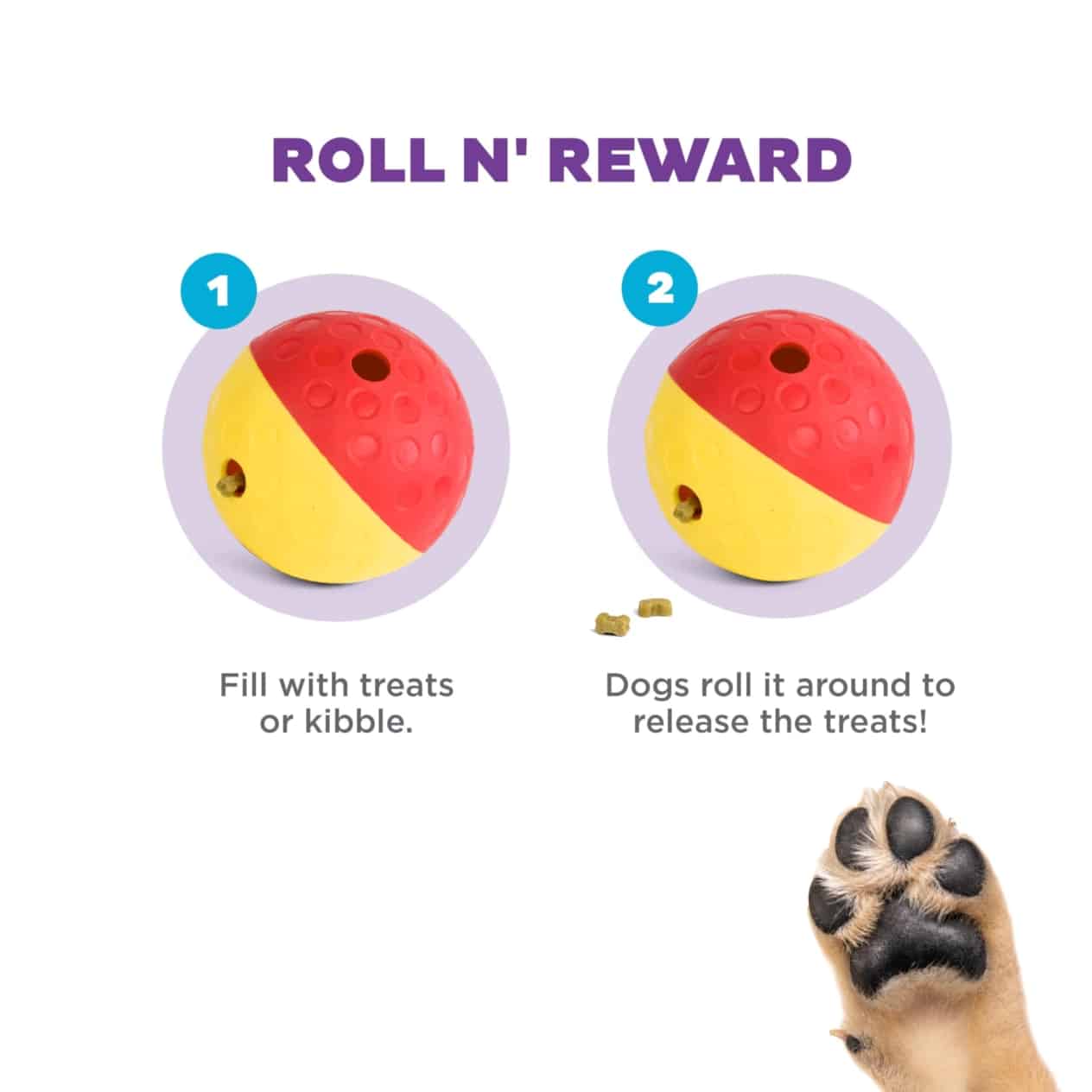 Das ist ein Spenderball mit Löchern, in die Leckerlis gesteckt werden. Wenn dein Hund den Ball mit seiner Nase oder seinen Pfoten rollt, fallen Futterstücke aus dem Inneren heraus. Das ist ein einfaches, aber lustiges Spiel, das die Bewegung und Konzentration fördert.