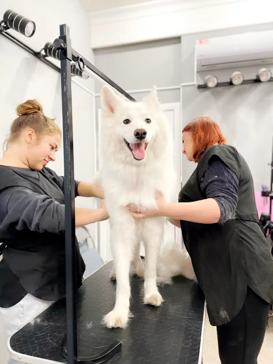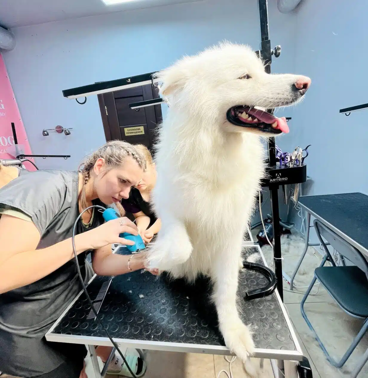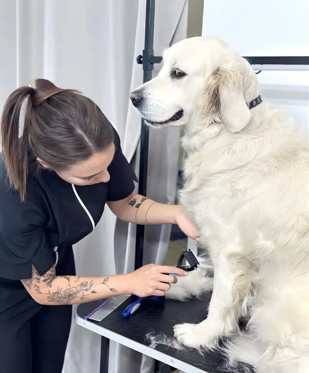 Professionelles Ausbürsten der Unterwolle (Furminator, Blow-Out usw.). Eine der wichtigsten Behandlungen für Hunde mit Doppelfell ist das professionelle Ausbürsten, das den Fellverlust deutlich reduziert und der Haut das „Atmen“ ermöglicht. Der Furminator ist eines der effektivsten Werkzeuge zum Entfernen abgestorbener Unterwolle, besonders während des Fellwechsels. Ebenfalls sehr wirksam ist das sogenannte Blow-Out – das Ausblasen der Unterwolle mit starkem Luftstrom, wodurch lose Haare schnell entfernt werden, ohne das Deckhaar zu beschädigen. Das ist besonders hilfreich bei Hunden mit dichter Unterwolle wie Huskys, Samojeden oder Spitzen, deren Fell oft ungleichmäßig in Büscheln ausfällt.