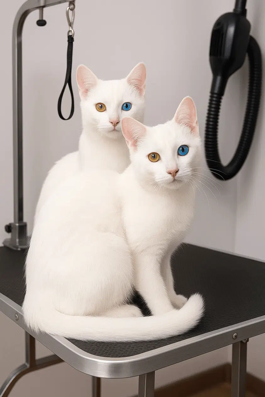 Es ist auch wichtig, diese Rasse richtig zu baden. Die Koa-Mani-Katze mag, wie alle Katzen, kein Wasser, daher ist die Pflege in einem Salon die beste Option. Hier werden spezielle Shampoos für weißes Fell verwendet, die nicht vergilben und die Haut nicht austrocknen. Ideal ist es, wenn der Groomer die Pflege mit einem weichen Conditioner ergänzt – er hält das Fell seidig, verhindert, dass es verklumpt und hält die Farbe leuchtend.