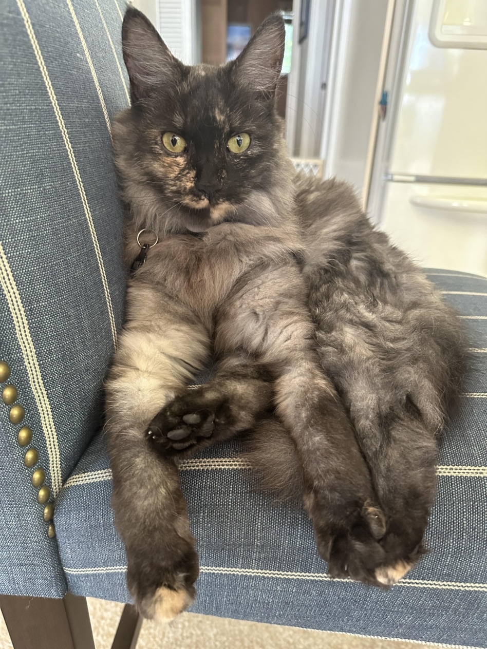 Tortie ist eine ungewöhnliche Schildpattfarbe, die durch die Beimischung von Colorpoint (siamesische Färbung) hervorgehoben wird.