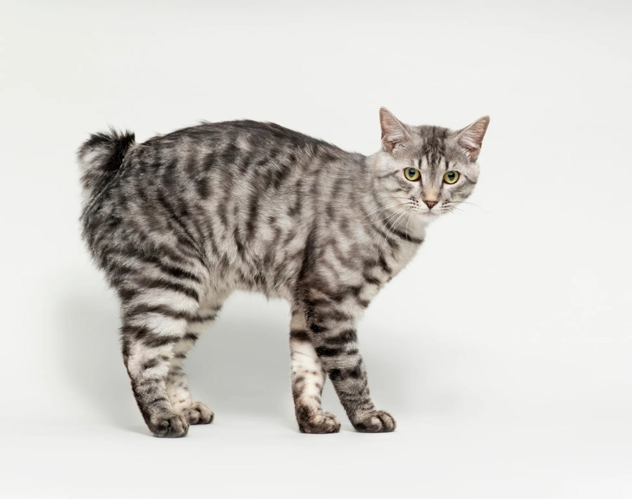 Japanischer Bobtail – hat eine klassische Farbe von Kattun oder bläulich-creme. Wie beim Kurilen Bobtail können die Augen verschiedene Farben haben, aber es kommt auch Blau hinzu.