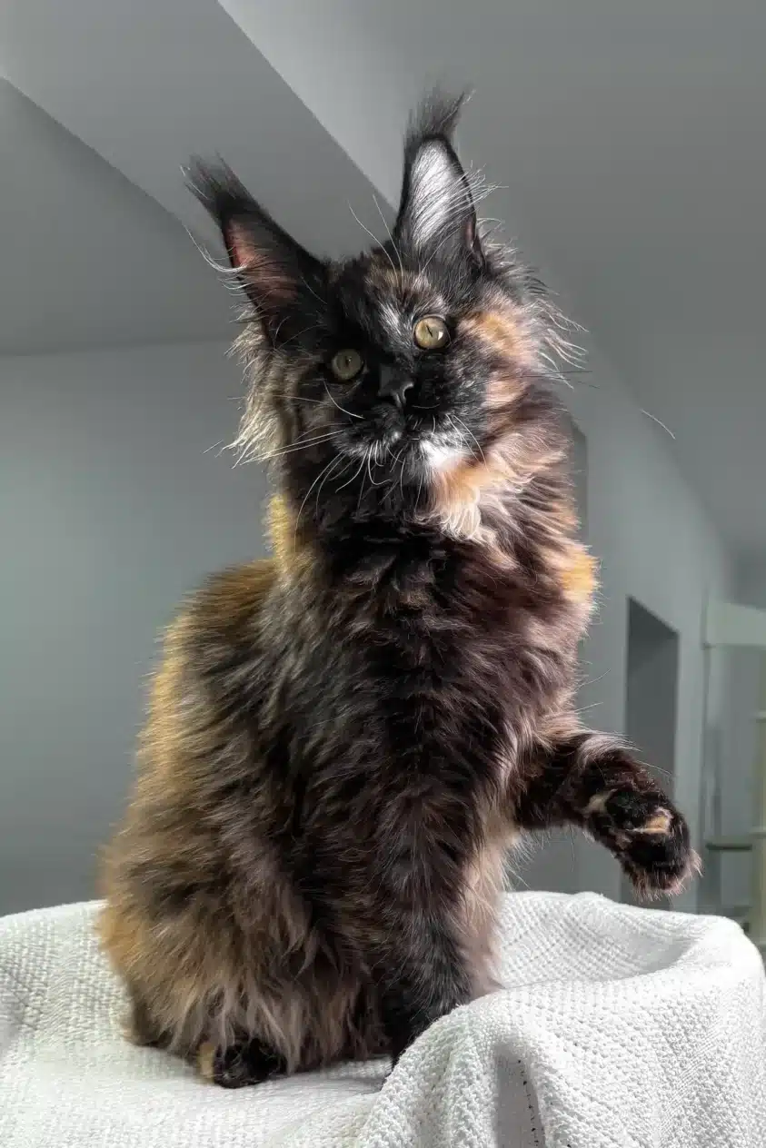 Maine Coon – riesige Katzen, die ein flauschiges Fell mit einer schuppigen Färbung haben. Meistens findet man sie in einer Kombination aus Schwarz und Rot, mit einem Zusatz von Weiß. Die Augen sind grün oder gelb-orange und auf ein symmetrisch gefärbtes Gesicht gemalt.