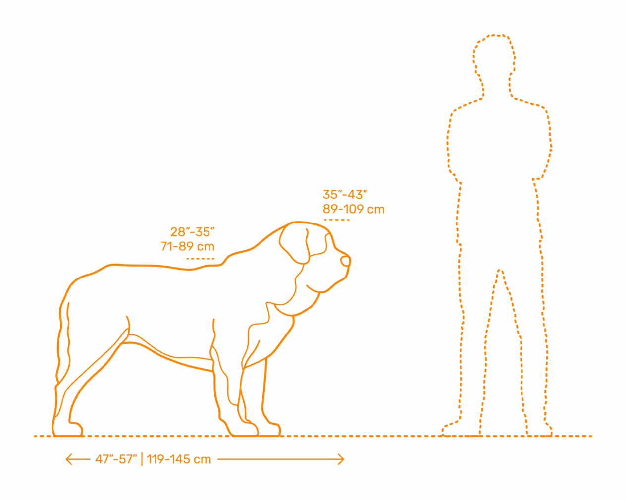 Das erste, was dir an dieser Rasse auffällt, sind ihre gigantischen Ausmaße. Ein erwachsener Hund kann zwischen 80 und 120 kg wiegen, manchmal auch mehr. Die Widerristhöhe erreicht bei Rüden 77-88 cm, bei Hündinnen etwas weniger, aber nicht weniger beeindruckend.