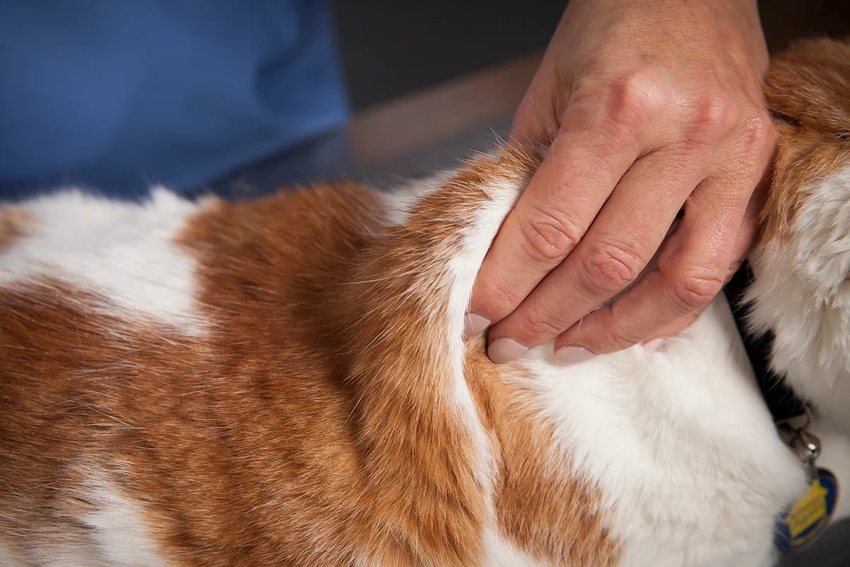 Hebe die Haut zwischen den Schulterblättern leicht an, um eine „Falte“ zu bilden;