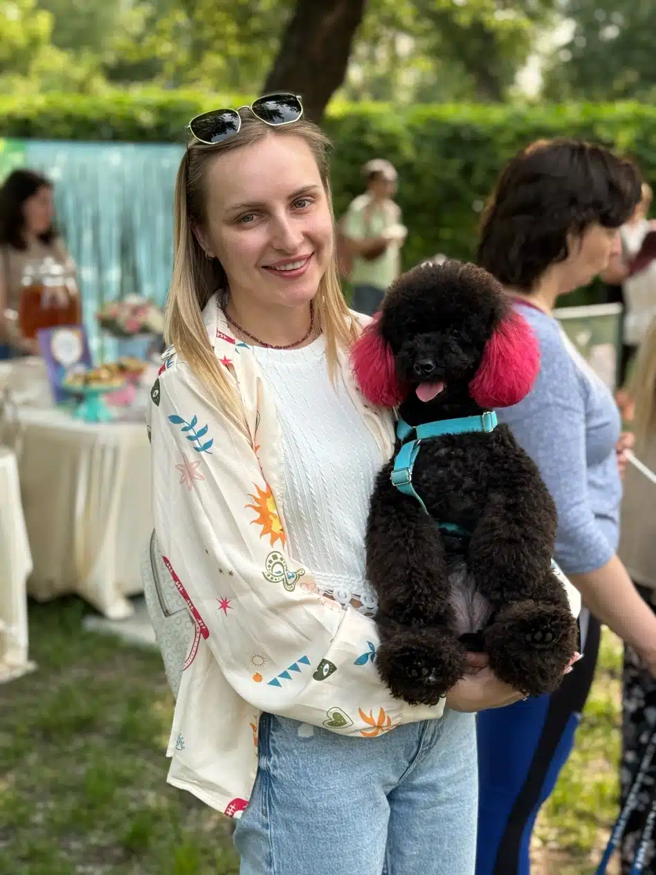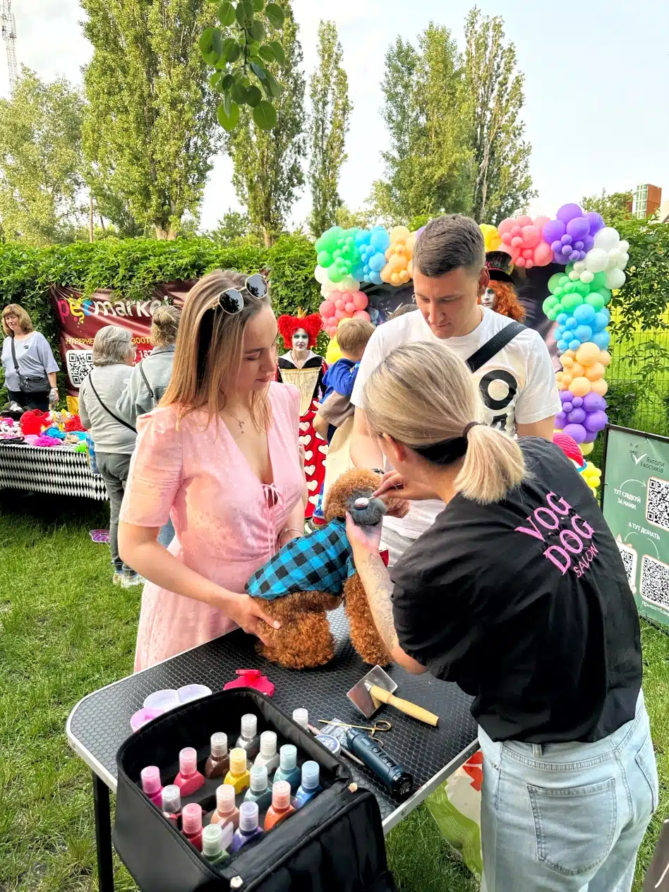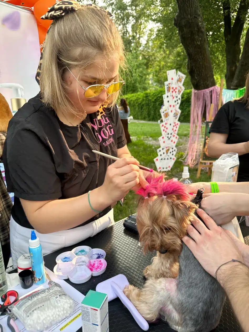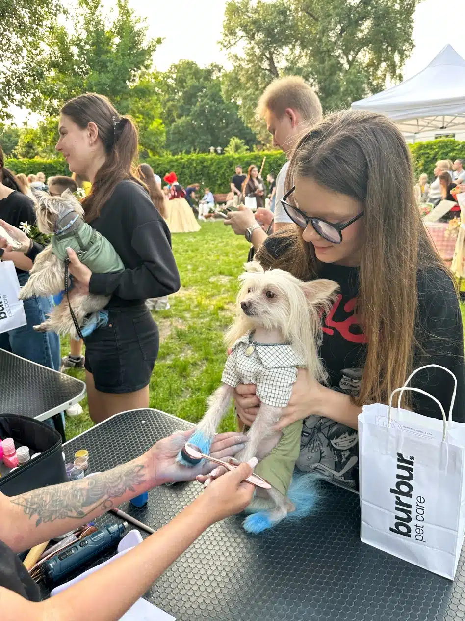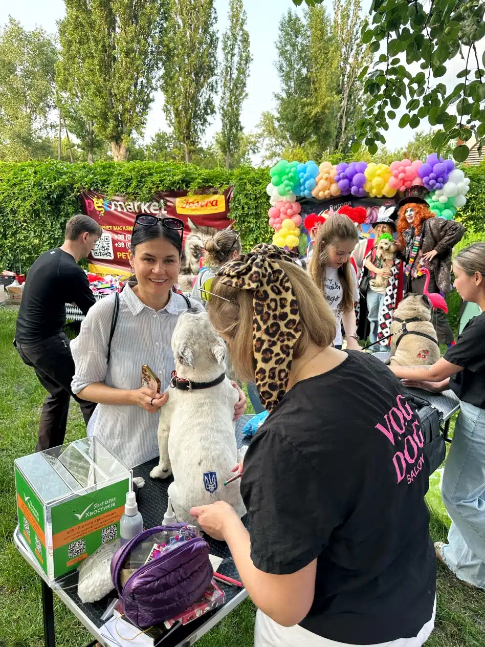 Clients include pugs, yorkies, huskies, maltipoos, bulldogs, Chinese Cresteds. Some of them just had to be scratched, some had to be colored, and sometimes just had to be hugged. One deaf French bulldog from the shelter was given a glitter tattoo in the form of the Ukrainian coat of arms – this moment became a symbol of the whole day.