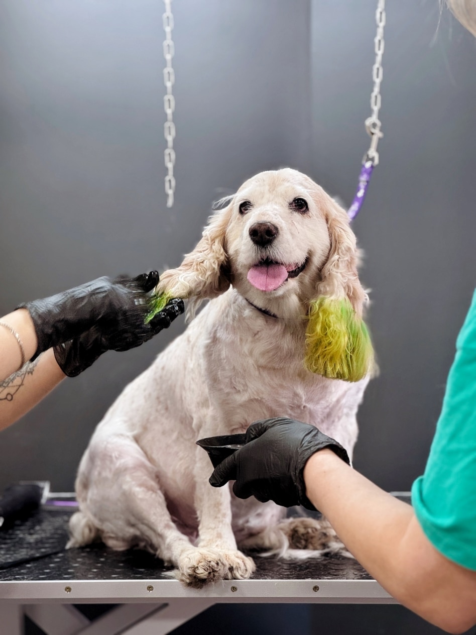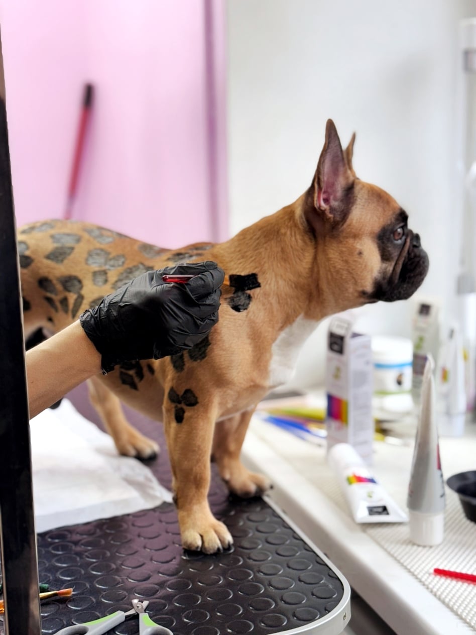 - Coat preparation — the groomer thoroughly washes and dries the dog to ensure even color application