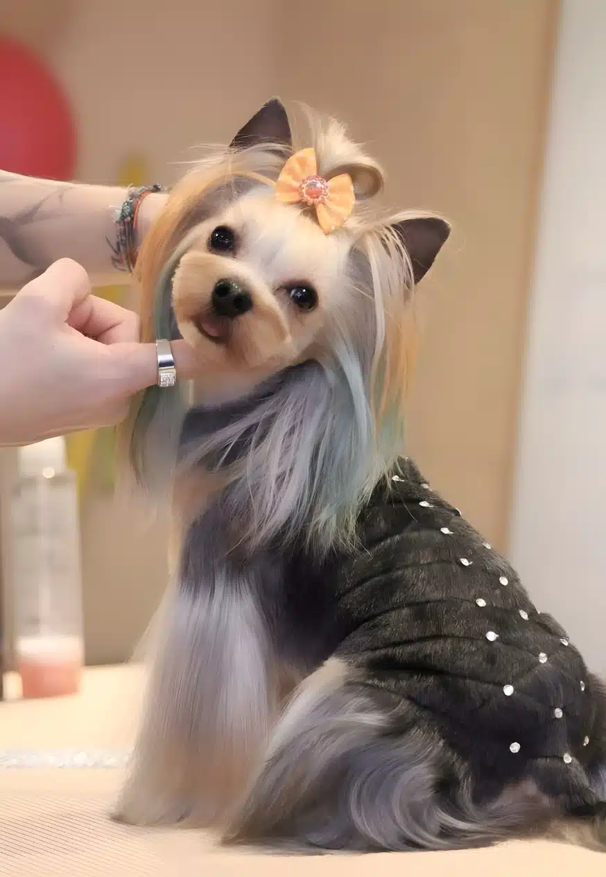 Yorkshire Terriers are ideal for creative grooming. Their silky, smooth coat resembles human hair – it holds shape perfectly, it is easy to create clear lines, transitions and color effects. In addition, Yorkies usually have a kind character, accustomed to attention and care, so they tolerate the procedures well and willingly “pose” after grooming.