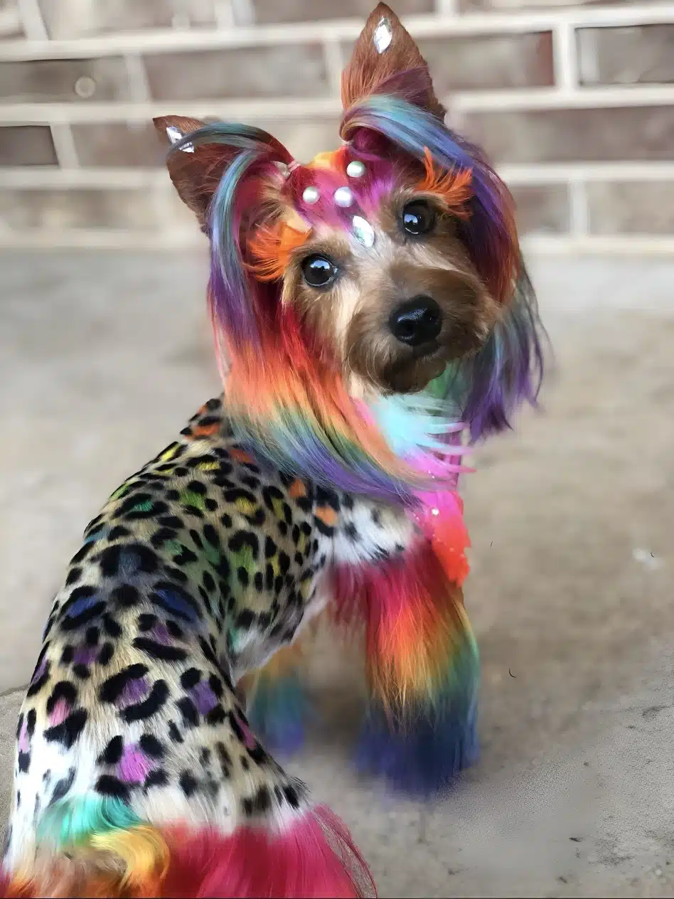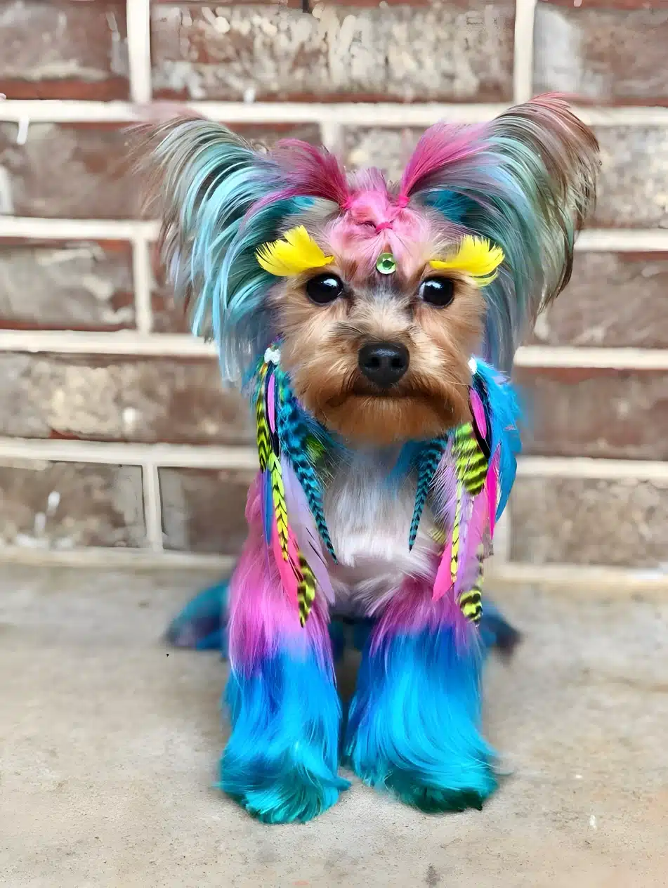 Add glitter or ombré effect and your Yorkie will look like an art object on the legs. By the way, many colors wash off in 3-6 weeks, so you can change the image even every month.