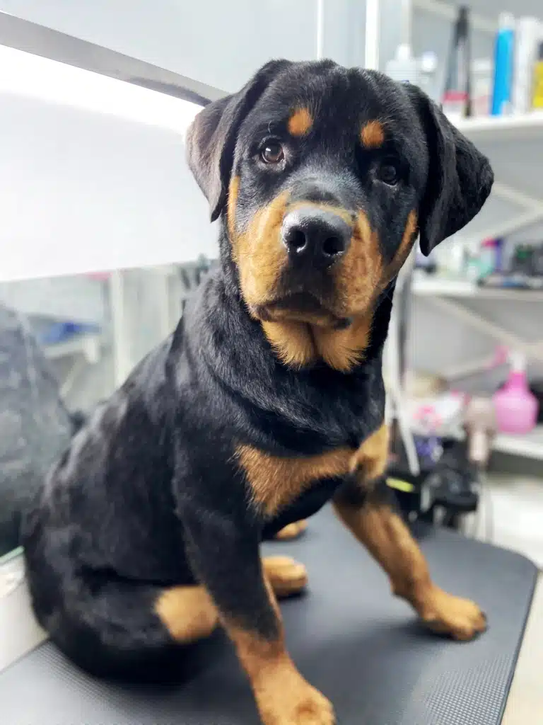 Rottweilers often have a protective instinct and may distrust strangers. That's why at V.O.G DOG SALON we make an adaptive acquaintance: the groomer first allows the dog to sniff the tools, speaks in a calm voice, and works without sudden movements. If necessary, procedures are performed in the presence of the owner.