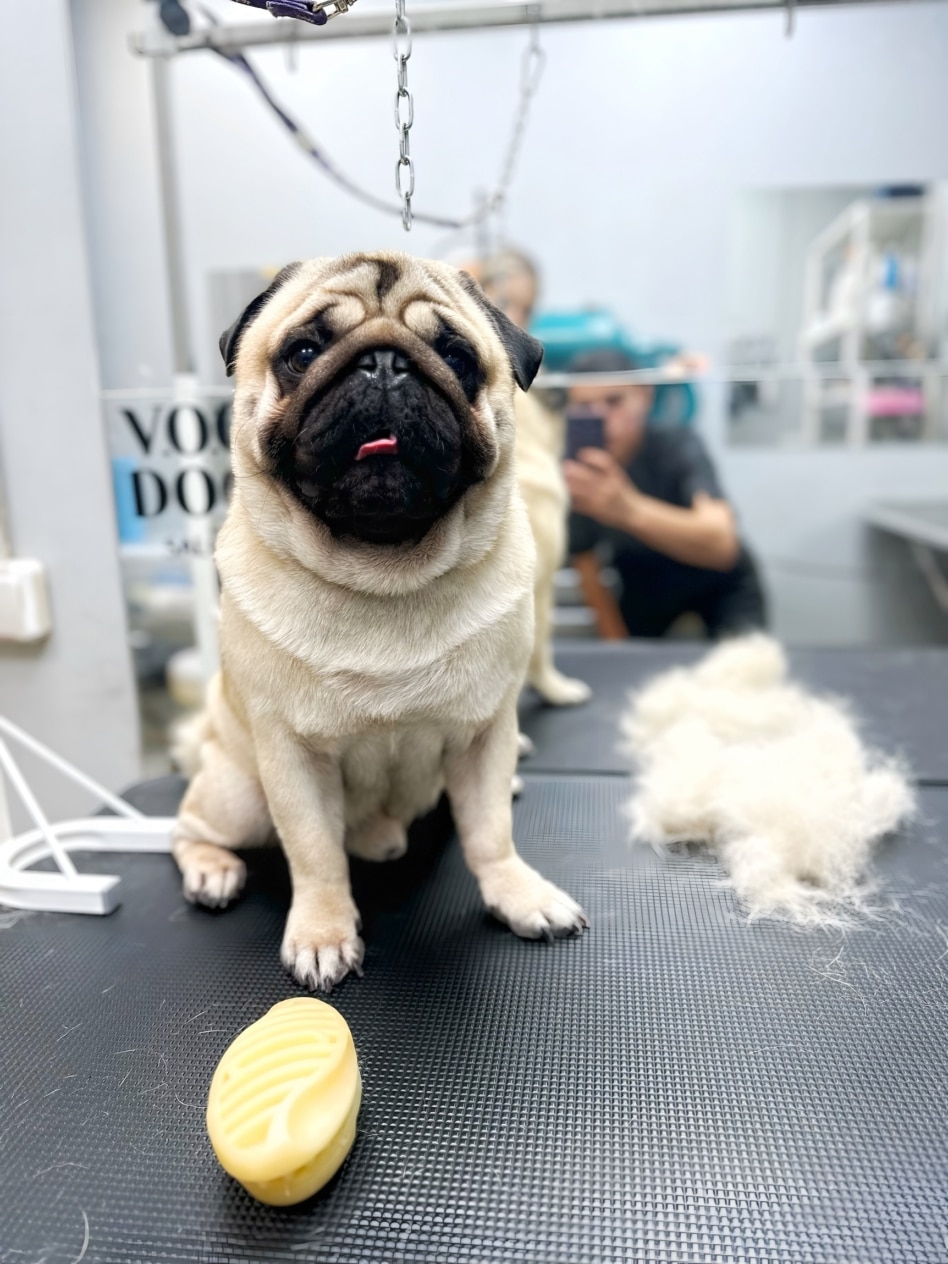 Pugs need regular and proper care. Regular walks, a balanced diet and attention to health will help keep your Ponytail around for many years. If you need professional help with pug care, we invite you to our salons V.O.G DOG SALON, where your pet will be provided with high-quality grooming and care!