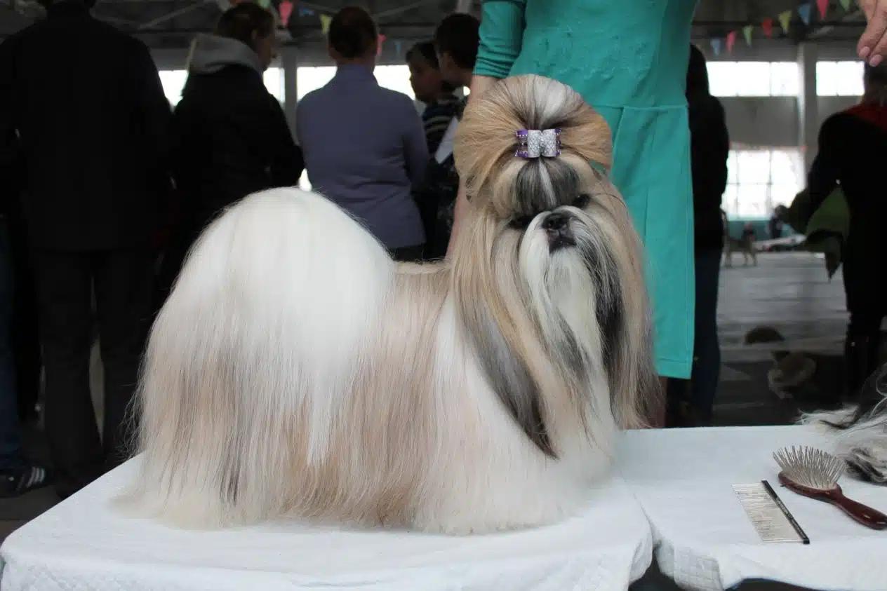 Shih Tzu show haircut involves trimming the coat evenly all over the body, leaving it long and well-groomed. The biggest challenge is keeping it clean, shiny and in the correct direction of growth. The groomer must carefully work with each strand so that the coat falls in perfect even lines without tangling. On top of this, show Shih Tzu’s wear special top-knot hairstyles that need to be tied and refreshed regularly. This is one of the most complicated hairstyles that requires daily care and professional maintenance.