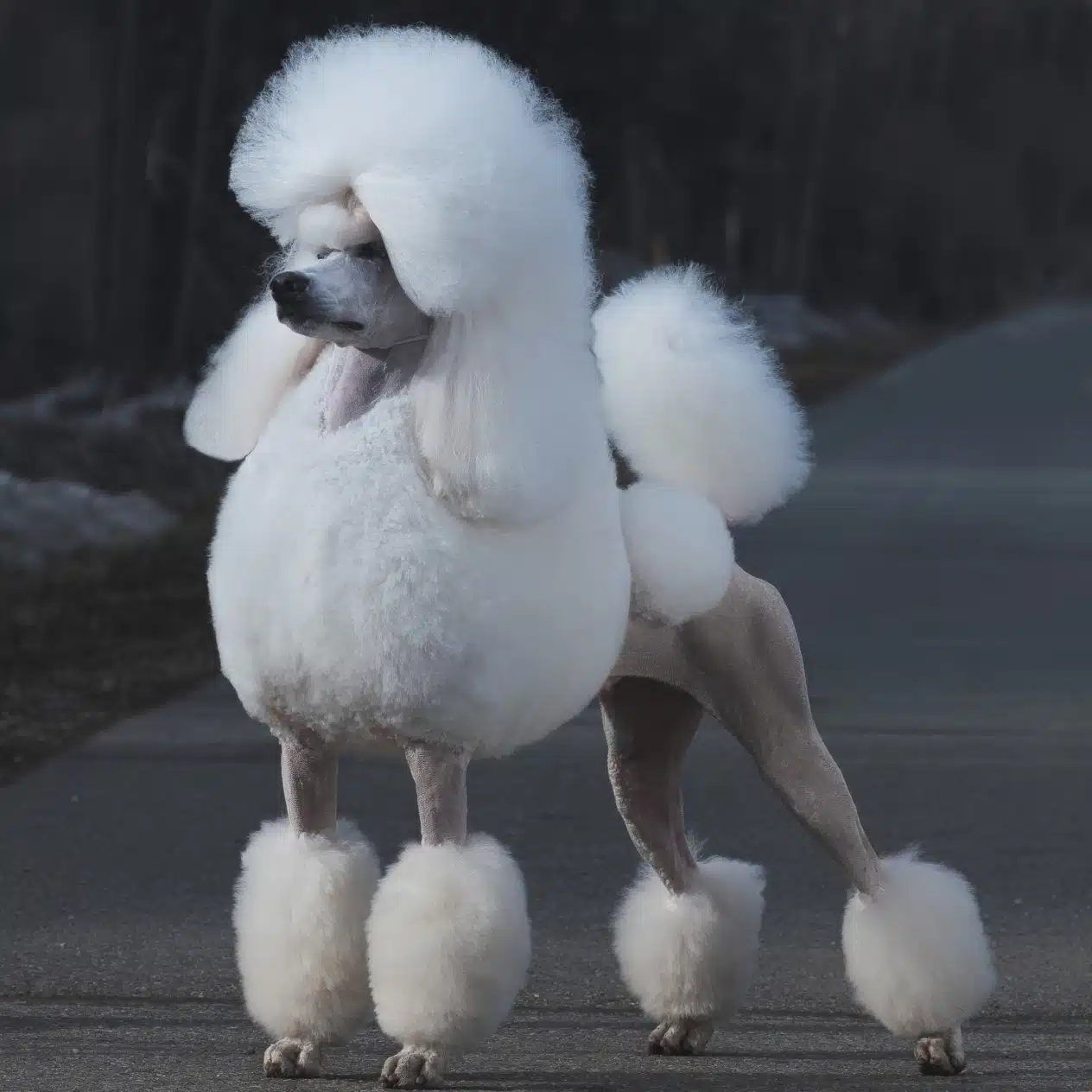 One of the most challenging and prestigious haircuts in the world is the continental poodle haircut. It is a classic show hairstyle that emphasizes the elegance of the breed. It involves shaved body parts, leaving voluminous “pompoms” on the paws, tail and chest. The most difficult part of this haircut is to maintain a balance between the shaved areas and the fluffy areas, ensuring a clear symmetry. The groomer must maintain the proportions to keep the dog looking harmonious, as well as trim the coat properly so that it does not lose its texture. Because of the constant growth of the poodles’ coat, this haircut needs regular adjustments and maintenance.