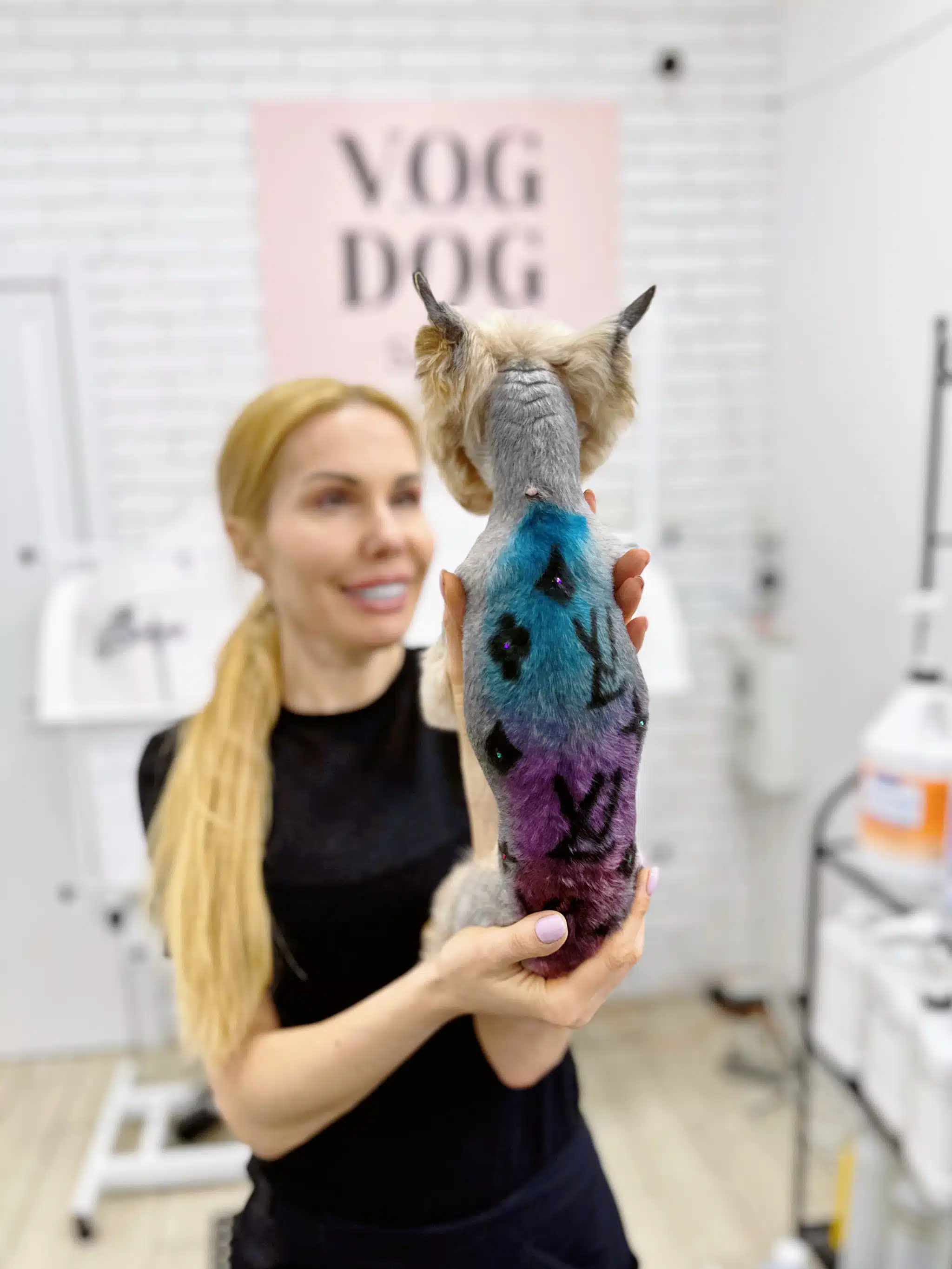 - Creative grooming goes beyond traditional grooming, adding elements of creativity and individuality to your pet’s appearance. Dyeing wool is one of the most popular methods of creative grooming. Special paints are used for this process, which are safe for animals. The groomers of our network systematically take part in various creative competitions, where they gain new impressions and experience. You can read more about creativity and its types in our blog at the link: https://vogdog.com/en/the-art-of-creative-grooming-beyond-the-ordinary