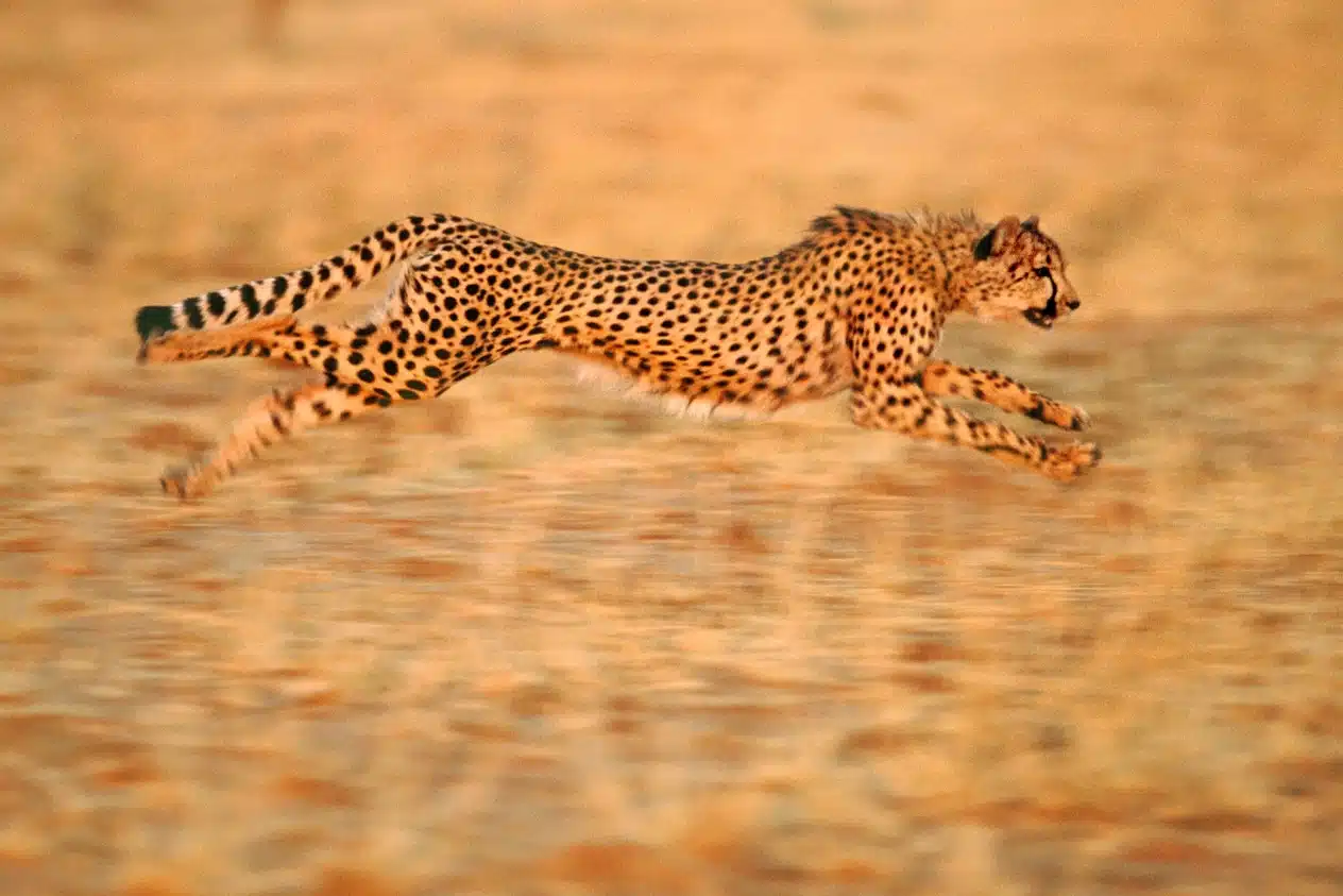El guepardo es el ave más rápida de la Tierra. Puede acelerar hasta 110-120 km/h, pero sólo en distancias cortas, de hasta 20-30 segundos. Es un «velocista» entre los animales, que debe su velocidad a su cuerpo flexible, sus largas patas y sus potentes pulmones.