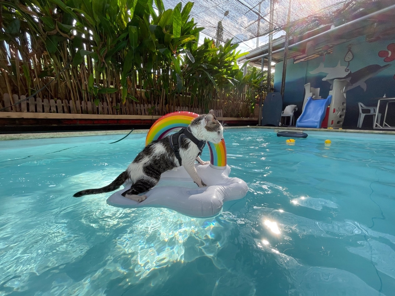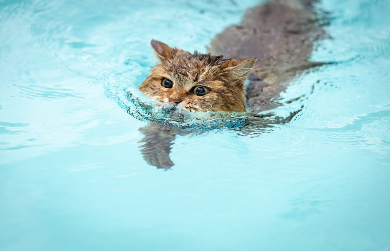 Si tu gato cae accidentalmente al agua, que no cunda el pánico. Lo más probable es que nade hasta la orilla por sí mismo. Pero nunca le obligues a nadar si no quiere. Para la mayoría de los gatos, el agua es un factor de estrés, y el baño «forzado» puede causar un miedo duradero al mero sonido del grifo o del baño.