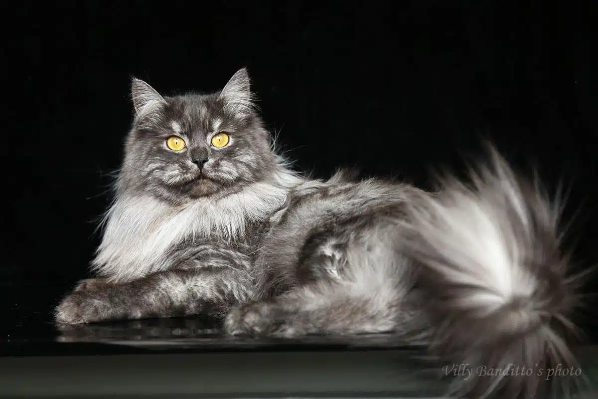 Lafumée noire crée un effet de profondeur et de contraste. Au repos, le chat a l’air sombre, presque monochrome, mais lorsqu’il marche, saute ou pendant le toilettage, de légers éclats de sous-poil sont perceptibles. Cette couleur est particulièrement expressive chez les races à poils longs.