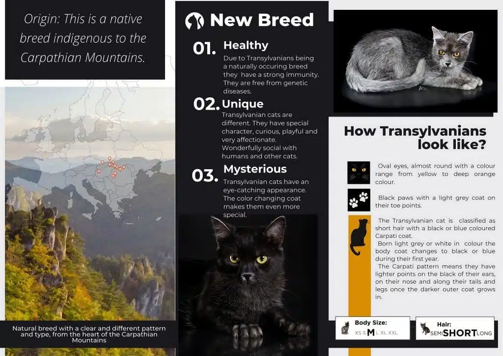 Le chat transylvanien a un pelage court et dense avec un sous-poil doux qui crée un effet « fumé ». Sa coloration est appelée « motif des Carpates » (Carpati pattern) : les chatons naissent presque clairs, mais en grandissant, le pelage s’assombrit, ne laissant que des pattes, un museau, des oreilles et une queue de couleur claire. Ce contraste donne l’impression que le chat est recouvert d’une brume de montagnes. Les variations de couleur les plus courantes sont le noir et le bleu. Les yeux sont généralement jaunes ou ambrés, ce qui ajoute à la beauté sauvage de l’animal. La carrure est moyenne, musclée, le corps est souple, les pattes sont fortes et le regard est perçant et attentif.