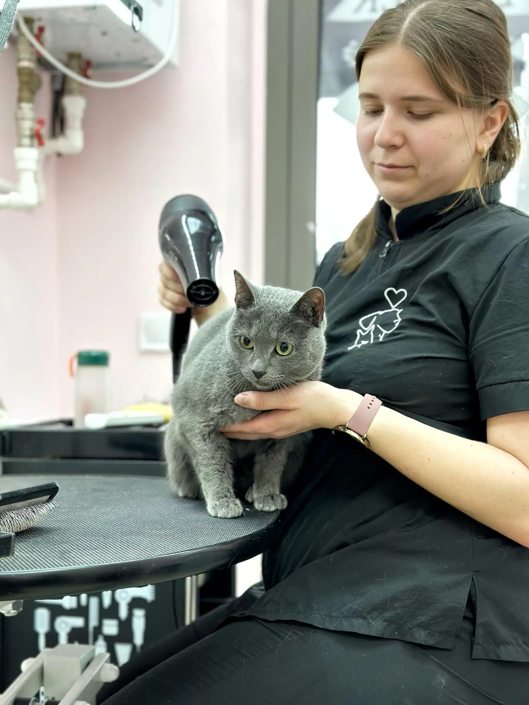 - Під час першого візиту або під час стрижки вас можуть попросити залишитись поруч з котом, адже присутність власника може забезпечити коту відчуття безпеки та заспокоєння під час процедури. Ваша присутність може допомогти грумеру уникнути ситуацій, які можуть бути неприємними для кота, наприклад, якщо він відчуває дискомфорт або страх.