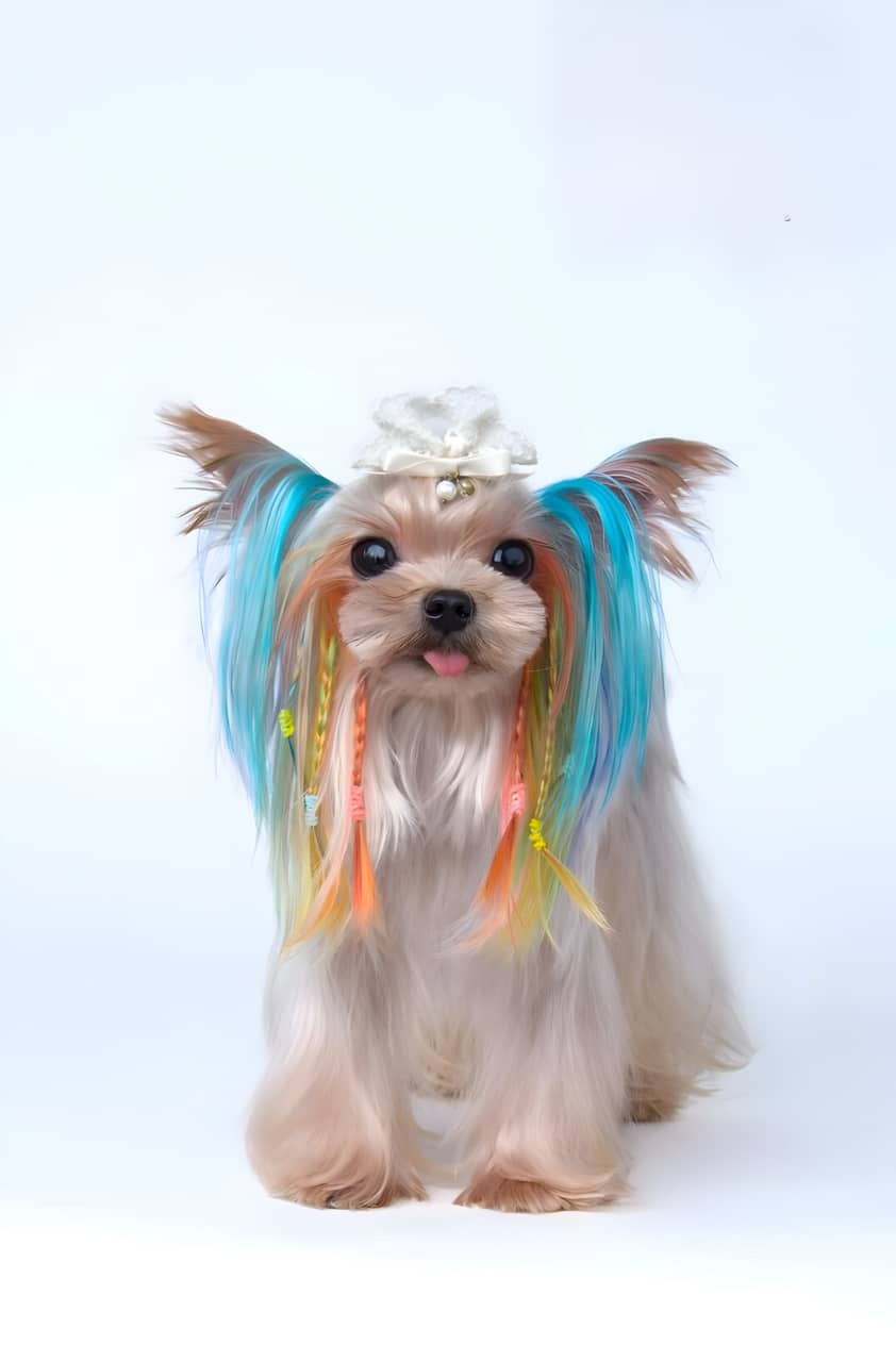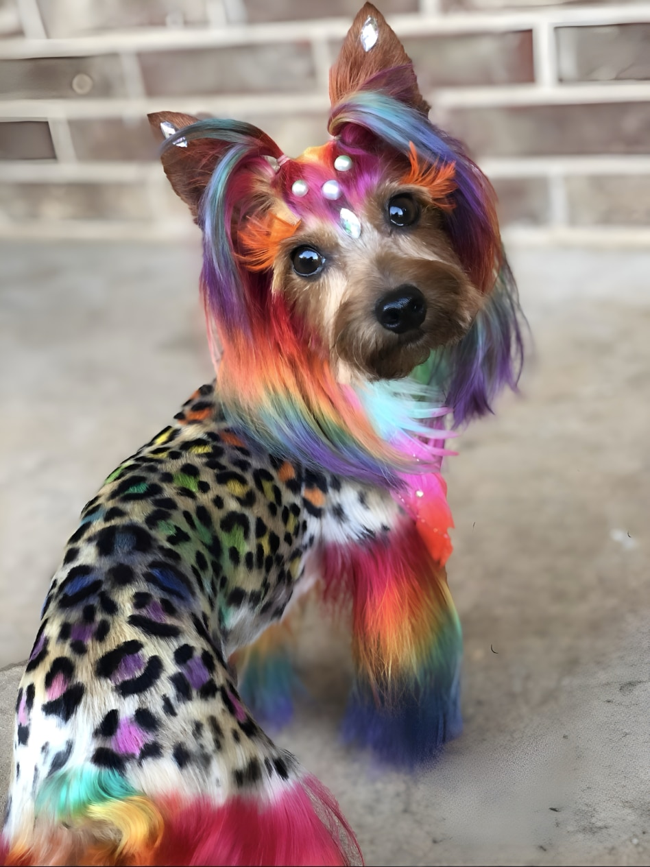 Додай до цього блискітки або ефект омбре — і твій йорк виглядатиме як арт-об’єкт на ніжках. До речі, багато фарб змиваються за 3–6 тижнів, тому образ можна змінювати хоч щомісяця.