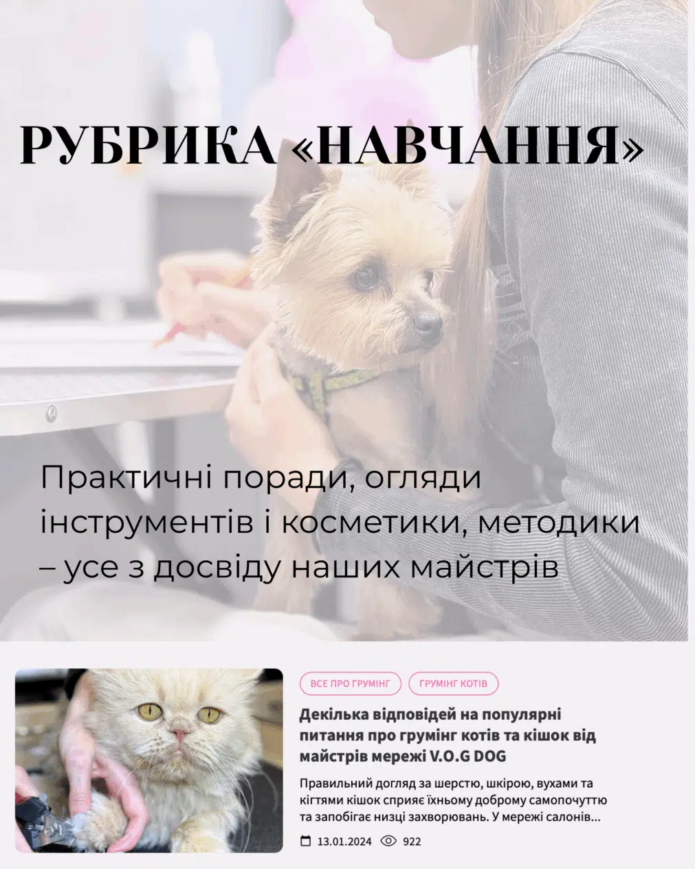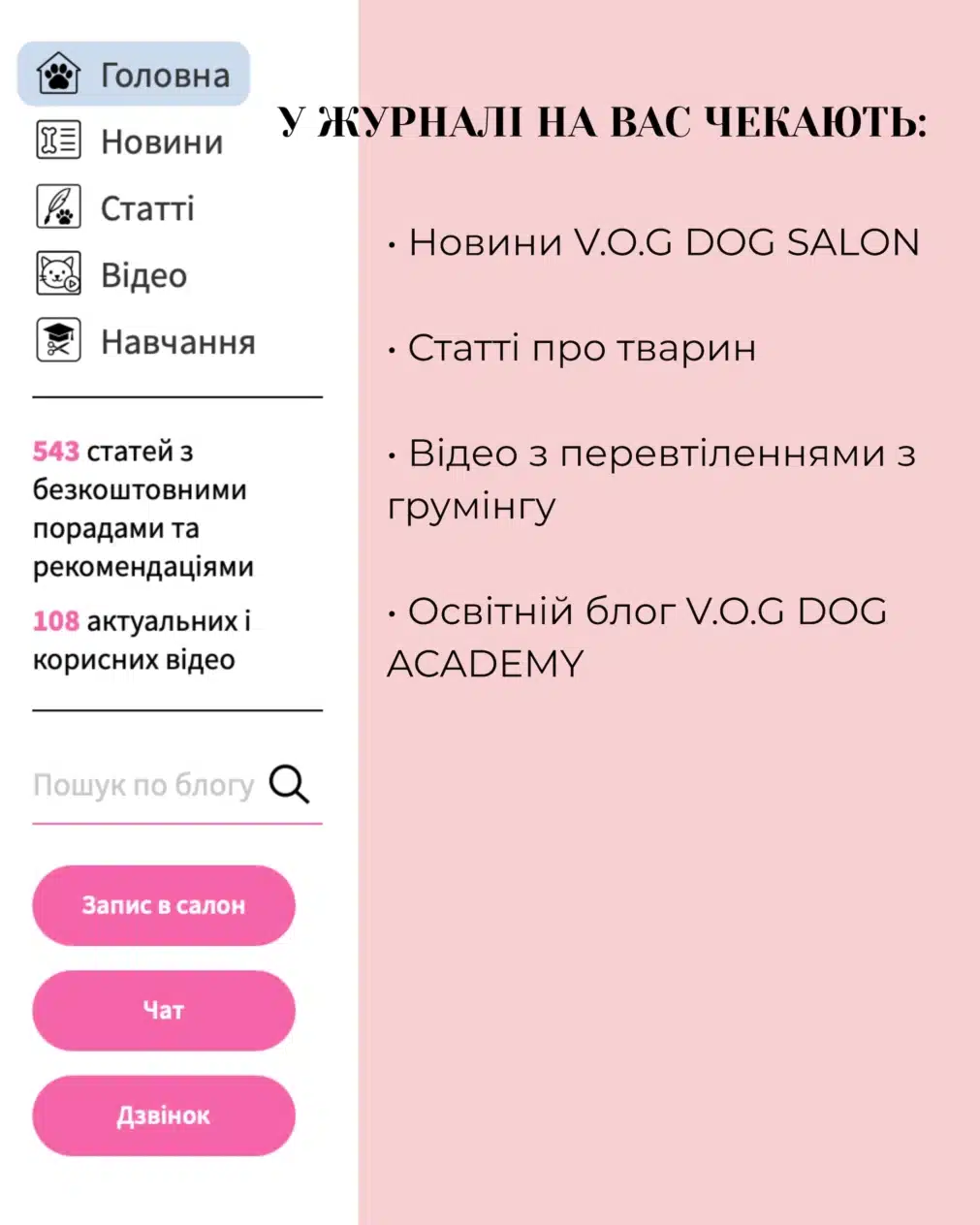 V.O.G DOG ЖУРНАЛ — це живий медіапростір, що створений руками людей, які щодня працюють із собаками і котами, знають їхні потреби, звички, емоції. Тут немає перекладених статей з іноземних сайтів, написаних чужими словами. У кожному тексті — наш досвід, наша практика. Ми не боїмося бути щирими, ми не ховаємося за нейтральними фразами — ми ділимося реальним.