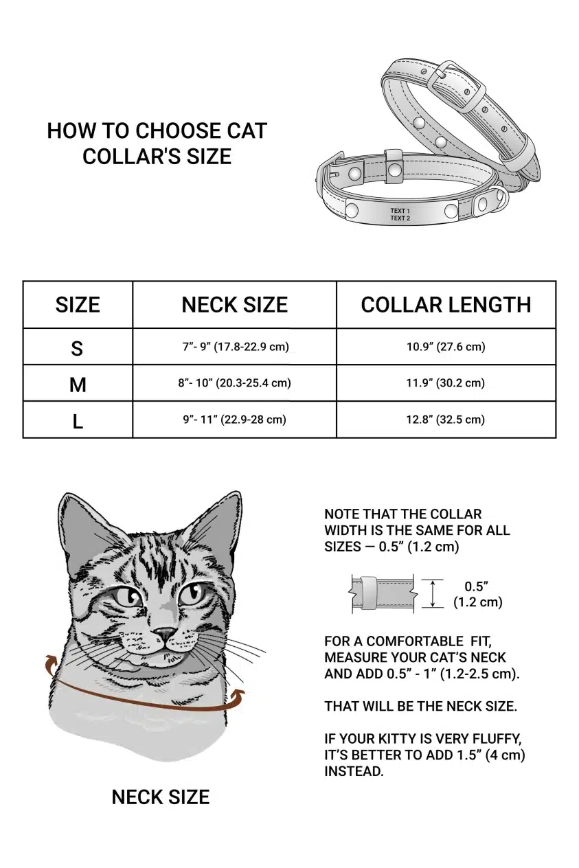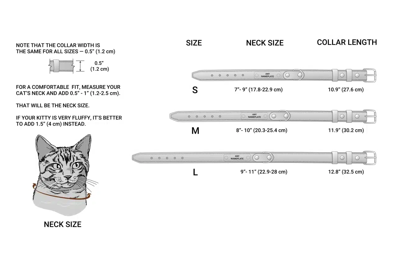 Prawidłowy rozmiar. Obroża powinna ściśle przylegać, ale nie uciskać. Wskazówka: 1 palec powinien zmieścić się między szyją kota a obrożą. Pamiętaj, że koty są bardzo elastyczne i mogą łatwo zdjąć lub odgryźć niewygodną obrożę.