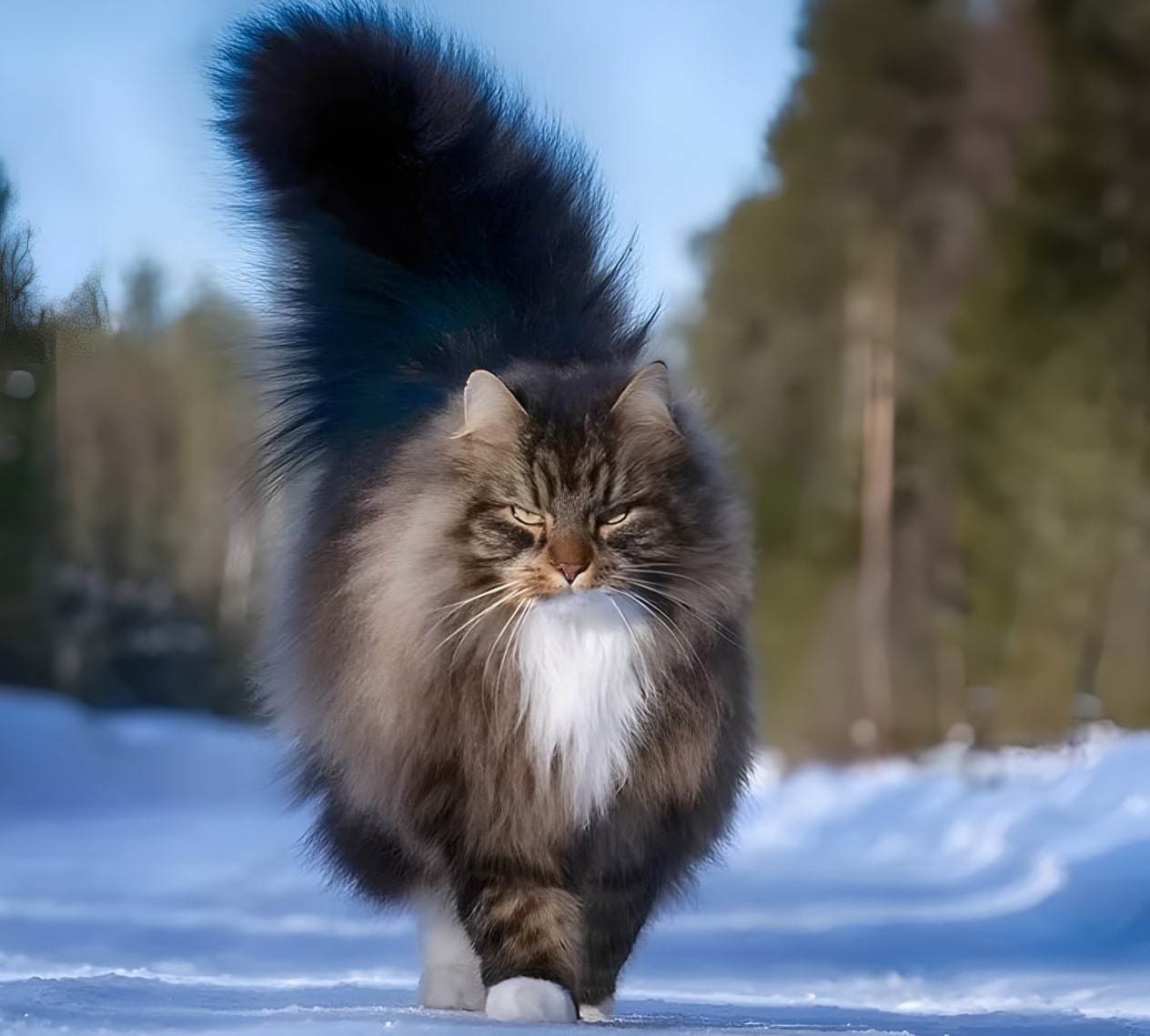Każde stworzenie ma swoje korzenie. Norweski kot leśny ma cały mit, osadzony w folklorze i przyrodzie Północy. Nazywany jest „kotem bogini Freyi”, bogini miłości, wiosny i… bitwy. Mówi się, że jej rydwan był ciągnięty przez te duże, niesamowicie puszyste, dumne zwierzęta, które mogą biegać po lesie tak cicho jak cień. I rzeczywiście, w norweskim kocie leśnym jest coś artystycznego i bojowego: wielkość, która nie wymaga dowodu i spokój siły, która zna swoją wartość.
