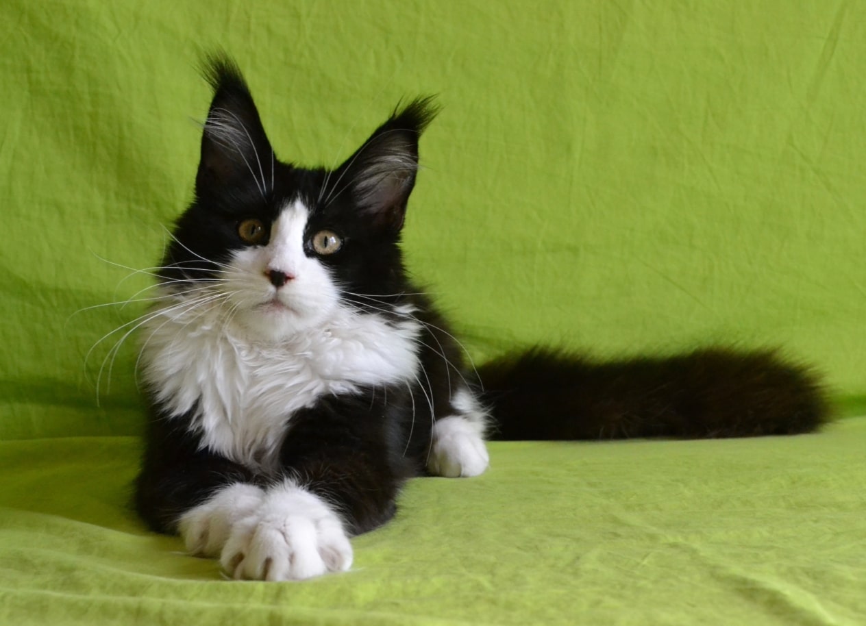 Te ogromne puszyste piękności z gęstą grzywą wokół szyi wyglądają wspaniale w każdym kolorze, ale smoking dodaje im szczególnego uroku. Kontrastujący biały śliniak na czarnym tle dodatkowo podkreśla ich majestat i zrównoważony charakter. Ten Maine Coon wygląda jak prawdziwy lord.