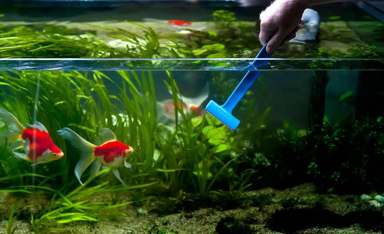 Akwarium nie wymaga codziennej interwencji, ale regularna pielęgnacja jest obowiązkowa. Raz w tygodniu należy wymienić 20-30% wody na świeżą, osiadłą, sprawdzić temperaturę i oczyścić ścianki akwarium z glonów. Gąbkę filtrującą należy płukać w wodzie akwariowej co 2-4 tygodnie. Proszę nie zapominać o okresowym sprawdzaniu poziomu azotanów i pH – nawet za pomocą prostych testów ze sklepu zoologicznego.