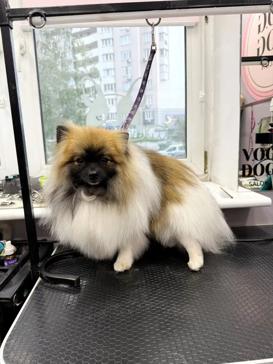 Jeden i ten sam pies może wyglądać zarówno jak puszysty lisek z bajki, jak i miękka zabawka o okrągłych oczach. Najpopularniejszą fryzurą jest „lis”. Ta fryzura pozostawia naturalną długość sierści, podkreśla wydłużony nos, wdzięczne nogi, ostry grzbiet i puszysty ogon, który pięknie leży w pierścieniu. Zachowuje anatomiczne cechy rasy i nie uszkadza podszerstka. Taki kształt sprawia, że sierść wygląda na zadbaną.