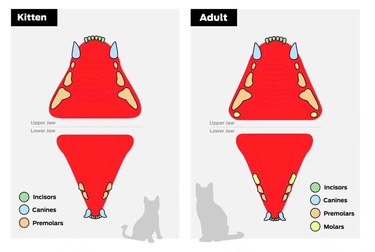 Teraz przyjrzymy się różnicom w wyglądzie zębów mlecznych u kociąt i szczeniąt. Przykładowo, kocięta wyrzynają się w wieku 13-14 dni, a w ich jamie ustnej wyrasta łącznie 26 zębów mlecznych. Te 26 zębów mlecznych obejmuje 12 siekaczy, 4 kły i 10 przedtrzonowców. Jeśli chodzi o siekacze, 12 siekaczy zawsze znajduje się z przodu, po 6 na górnej i dolnej szczęce. Kocięta mają również 4 kły, po 2 na każdej szczęce, które są wydłużone i ostre. Kocięta mają również 10 przedtrzonowców – małych, kanciastych zębów. U niemowląt 6 przedtrzonowców znajduje się na górnej szczęce, a tylko 4 na dolnej. Zęby trzonowe pojawią się później w wieku dorosłym. Uzębienie mleczne kociąt kształtuje się w ciągu 2 miesięcy i dotyczy to kotów wszystkich ras.