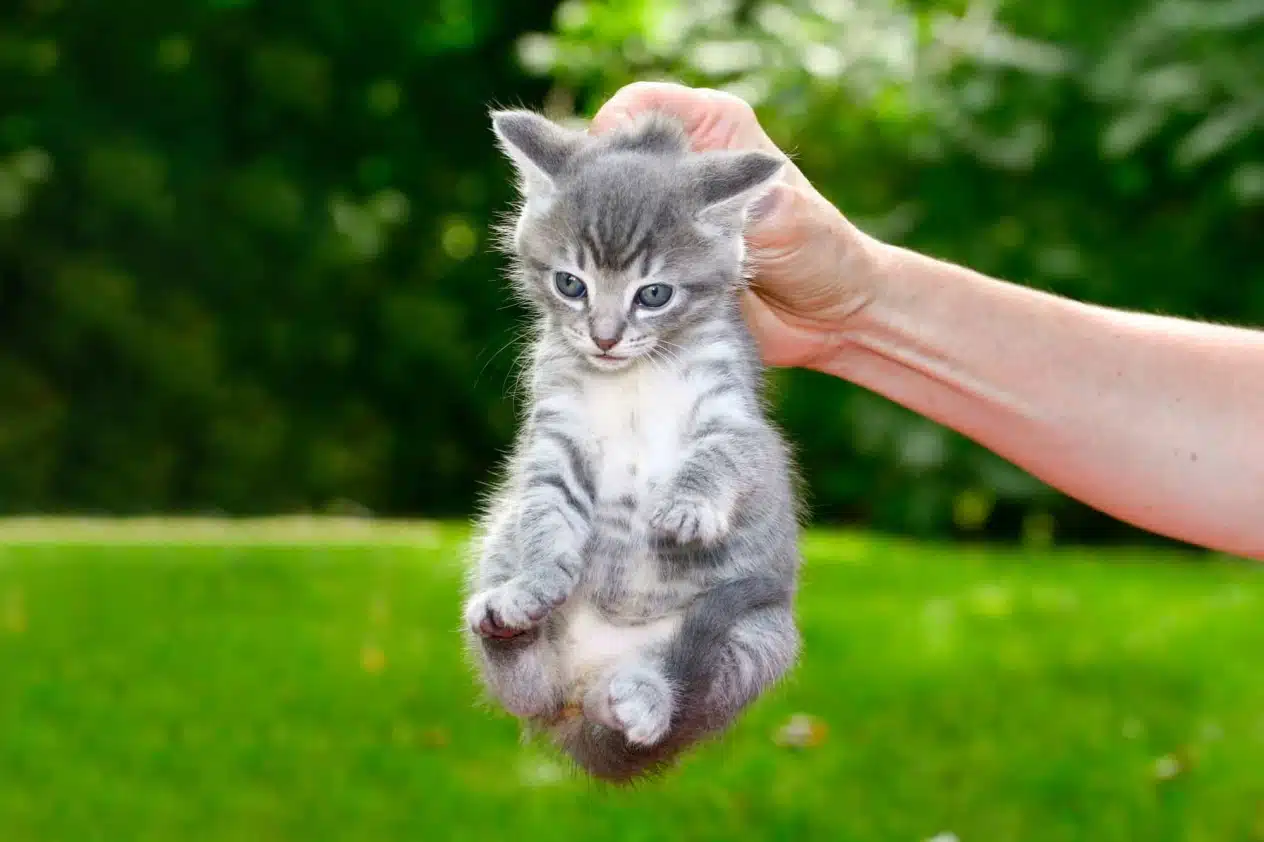 Маленький котенок еще не имеет большого веса в килограммах, поэтому это не несет ему опасности. А вот подняв кота весом более 3 или 4 килограмма и сжимая ему нервное окончание вы рискуете навредить его телу и здоровью в целом.