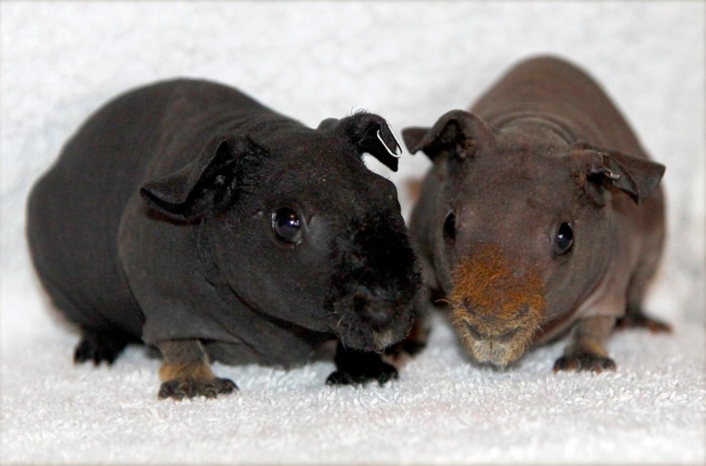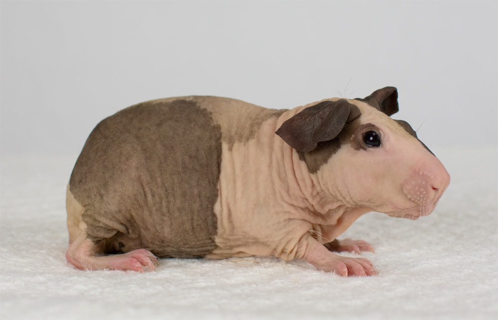 Если вы ищете что-то уникальное, порода скинни точно для вас. У нее нет шерсти, кроме небольшого пуха на носу и кавычках. Но это не значит, что уход за ней незначителен. Эти свинки очень чувствительны к температуре и внешним раздражителям, поэтому требуют дополнительного увлажнения кожи, утепления в холодное время года и защиты от солнца летом.