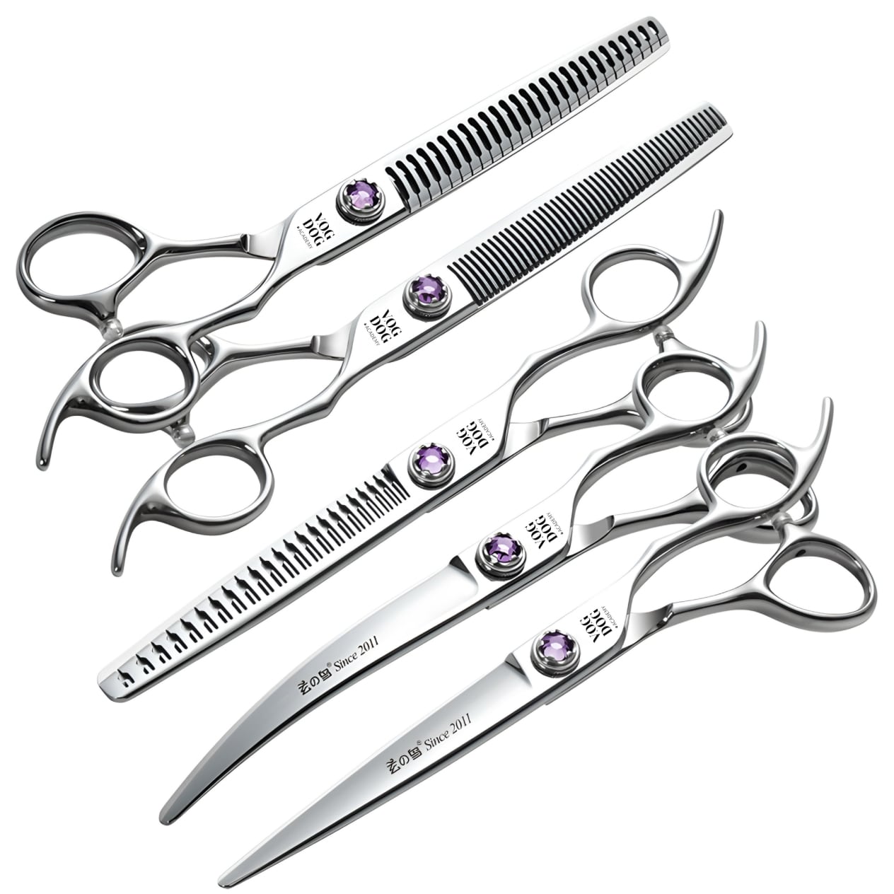 Изогнутые/контурные ножницы: Предназначены для работы с округлыми и сложными контурами тела животного, помогают создавать плавные формы.