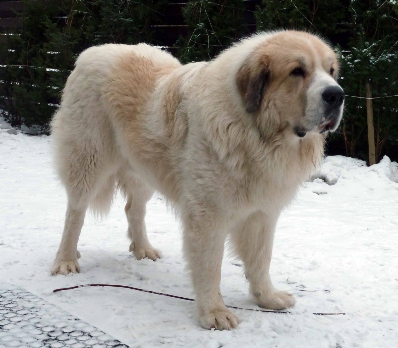 Размеры впечатляют: взрослый самец весит 70-100 кг, высота в холке — 75-82 см. Самки немного меньше. Огромная голова, глубокая грудь, мощные лапы — все в нем говорит о силе. Но эта сила не агрессивная. Это не боец, а защитник. Его шерсть длинная, плотная, белая с крупными пятнами — рыжими, серыми или черными. Шея часто имеет «гриву» — густой подшерсток, что придает ему львиный вид. Глаза — темные, добрые, спокойные.