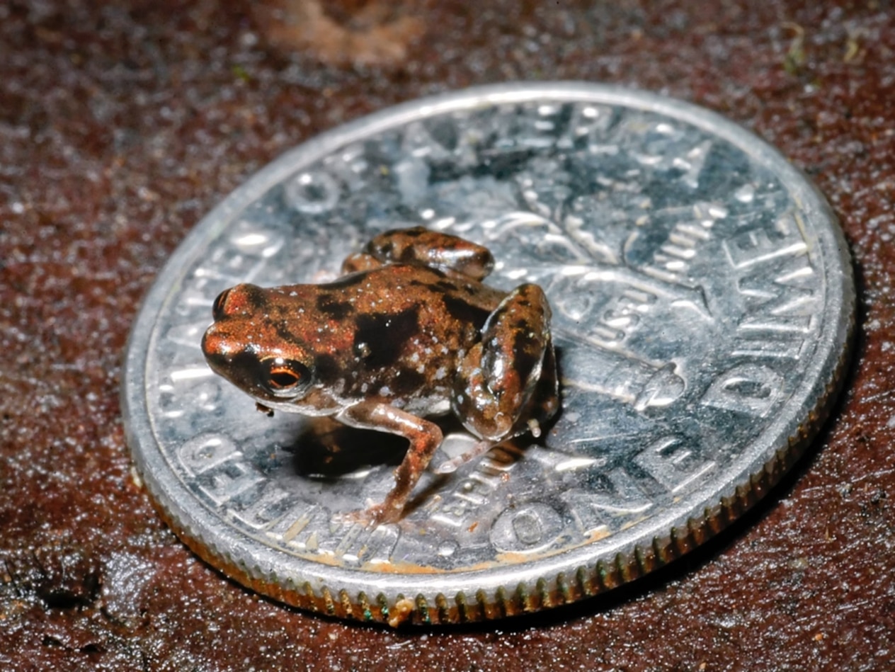 Этот крошечный амфибий родом из Папуа-Новой Гвинеи является самым маленьким позвоночным животным в мире. Ее длина — всего 7,7 миллиметра. Это меньше, чем диаметр обычной пуговицы. Оно живет в опавших листьях и совершенно незаметно для человеческого глаза. Его голос — тоненький, высокий звук, похожий на сверкание насекомых.