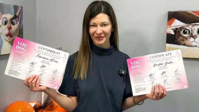 Молода дівчина в зеленому жилеті отримала диплом про успішне навчання на грумера