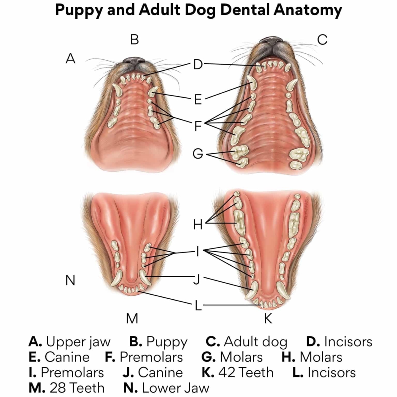У малечі є по два набори зубів: молочні (тимчасові) та постійні (дорослі). Молочні завжди прорізуються у тварин у ранньому віці, а потім змінюються на постійні. Проте види зубів у цуценят та кошенят однакові.